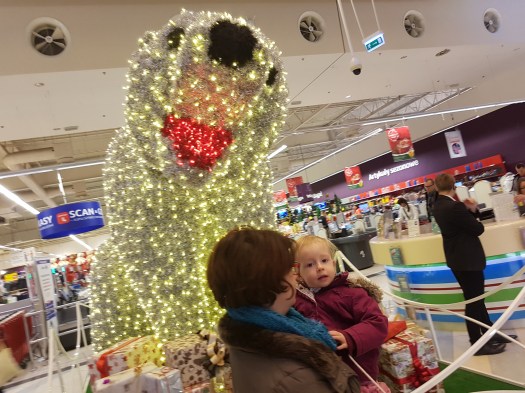 Oprócz ubierania choinki były też zakupy… Pojechaliśmy po prezenty do jednej z galerii handlowych w naszym mieście a tam zastaliśmy wielką dekorację świąteczną – niedźwiedzia polarnego, który rusza głową. Pomyśleliśmy… no to po zakupach… teraz Mała nie będzie chciała już nigdzie iść, bo będzie chciała patrzeć na misia. No nie myliliśmy się, ale nie było aż tak źle… zrobiliśmy zakupy i zadowoleni skierowaliśmy się ku wyjściu. I wtedy pojawił się problem… Tym problemem była czapka, której Łucjobzik nie chciał za nic w świecie ubrać. Histeria, rzucanie się na ziemię, 50 razy powtarzane „nie, nie, nie”… i spokojne tłumaczenie, że trzeba ubrać czapeczkę, bo na zewnątrz jest zimno i zmarzną uszka. Pomogła dopiero groźba niepuszczania „śpiewanek”. Tym sposobem zakupy świąteczne można było uznać za zaliczone.