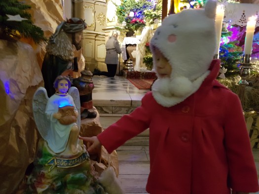 Myślę, że wielu z Was – mających maluszki – przerabiało (albo przerabia) ten temat. Szopka to najfajniejsza dekoracja w całym kościele. Są w niej baranki, krówki, jelonki… no w sumie jest też św. rodzina, (W sumie to powinna być wymieniona na początku) ale najlepszy w całej stajence to jest aniołek, który kiwa główką, jak wrzucisz do niego pieniążek. Kiwa głową, mówi: „Bóg zapłać” i śpiewa kolędy. Fajna sprawa? Dla dzidziulka owszem.
