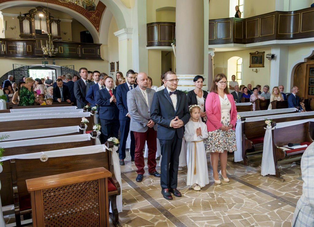 Po ceremonii przyszedł czas na zdjęcia z najbliższymi. Następnie udaliśmy się do wynajętego lokalu, domu harcerskiego, gdzie odbyła się dalsza część uroczystości. Ze względu na popołudniowy czas mszy, przed nią zorganizowaliśmy rodzinny obiad. Po mszy świętowaliśmy przy torcie, kawie, ciastach, a potem przy tzw. zimnej płycie. Panie kucharki przygotowały wszystko według wcześniej zaplanowanego menu, co przypominało organizację w popularnych salach weselnych.